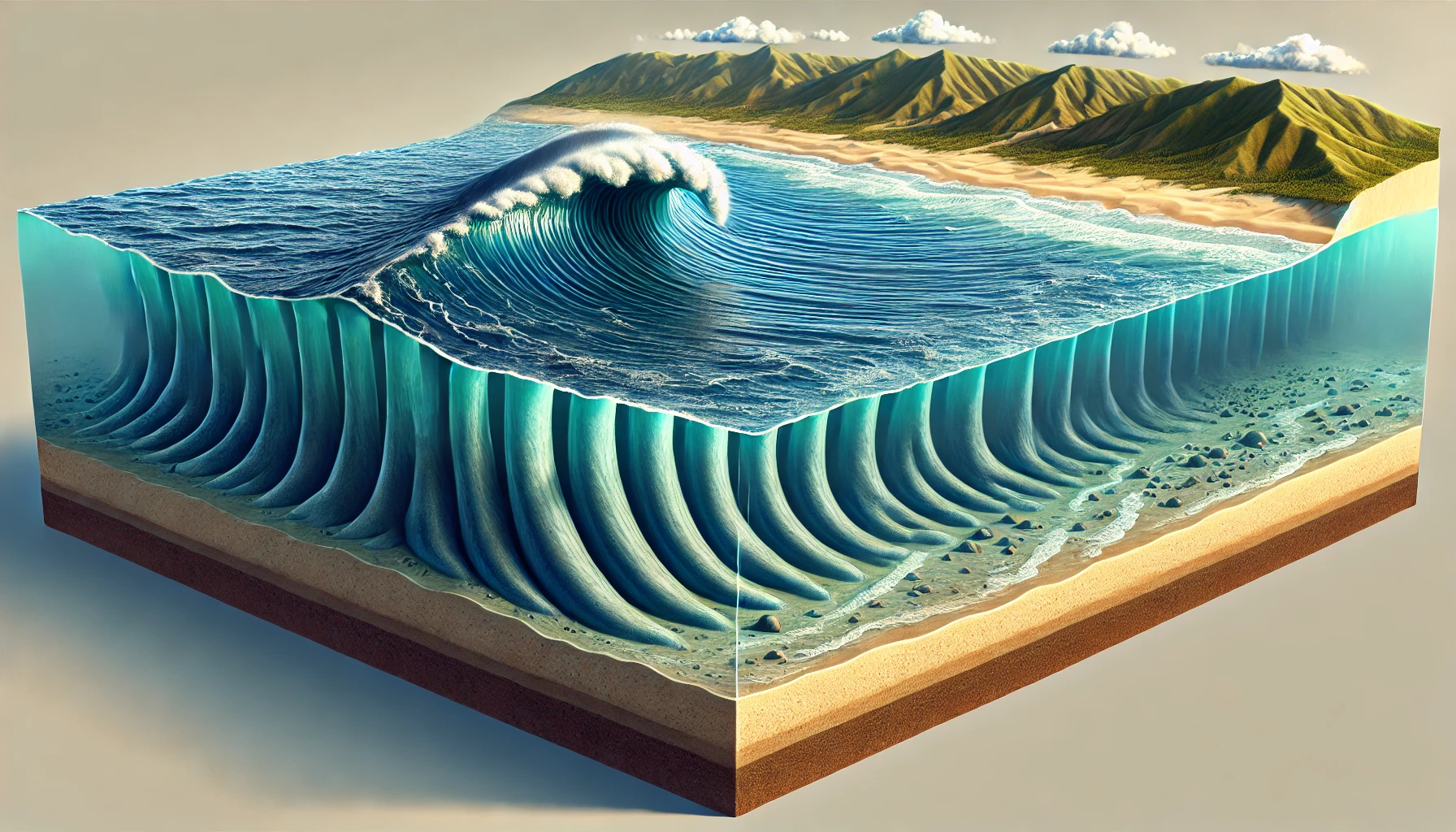 높이 변화: 바다 한가운데서는 높이가 수십 cm~1m 정도로 미미하지만, 해안에 가까워지면 파도의 에너지가 압축돼 수십 m의 높이가 됨.