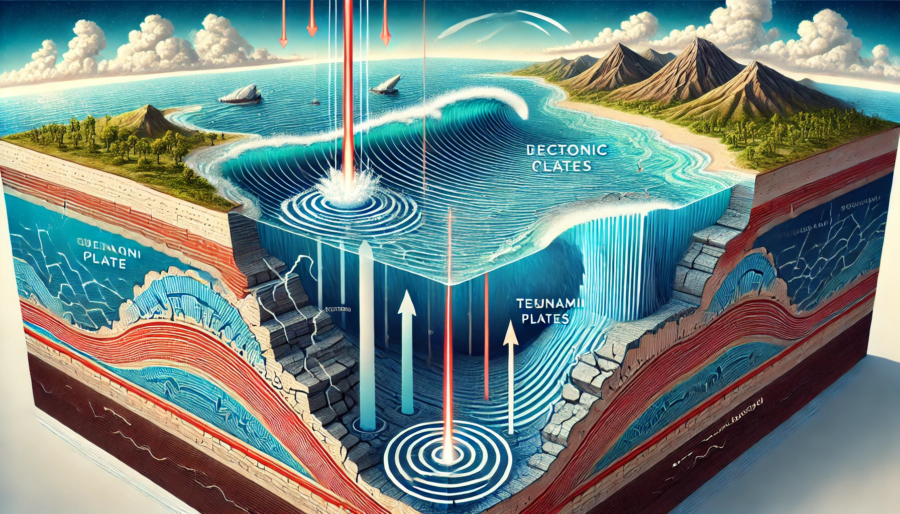 진앙지가 해저에 위치하고, 단층의 수직 변위가 수 미터 이상 발생하면 바닷물이 갑자기 위로 밀려 올라가 파동이 시작됩니다.